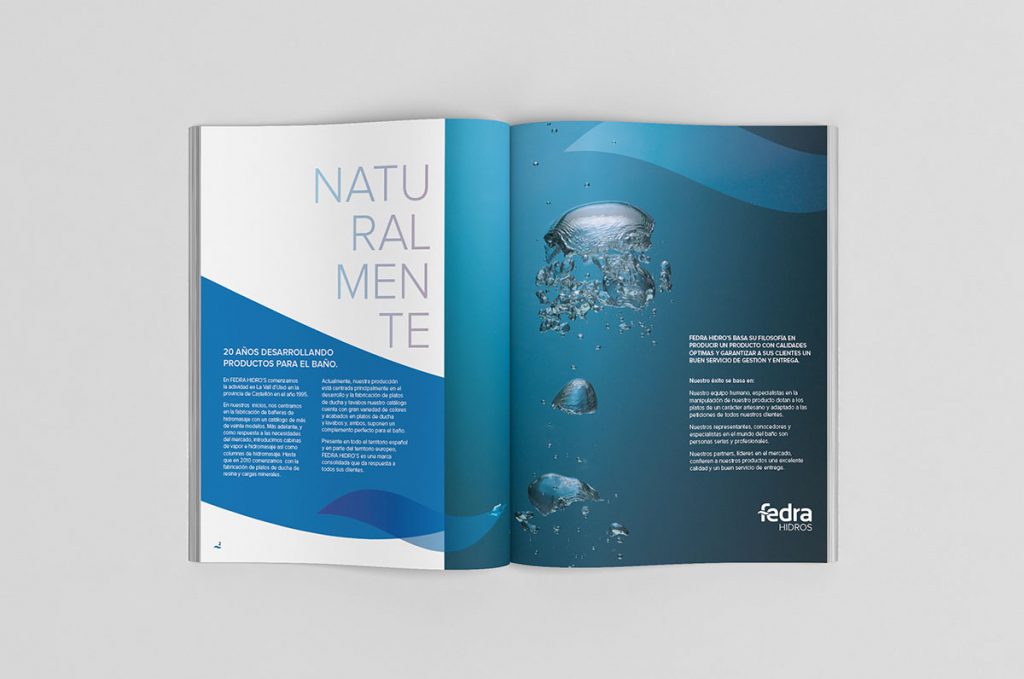 Diseño global para Fedra Hidros, empresa que produce elementos para el baño siendo su especialidad la fabricación de platos de ducha y encimeras de resina con diferentes acabados en cuanto a color y texturas.